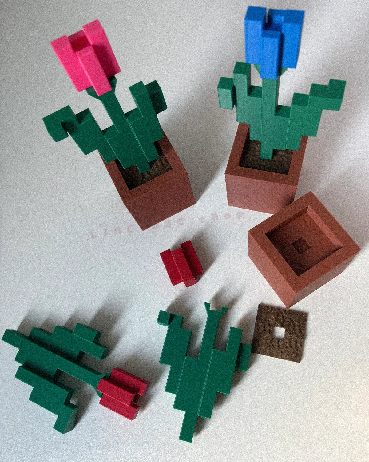 Pixel Tulip – Block-Style Potted Flower Desk Decor (Red / Blue / Pink)